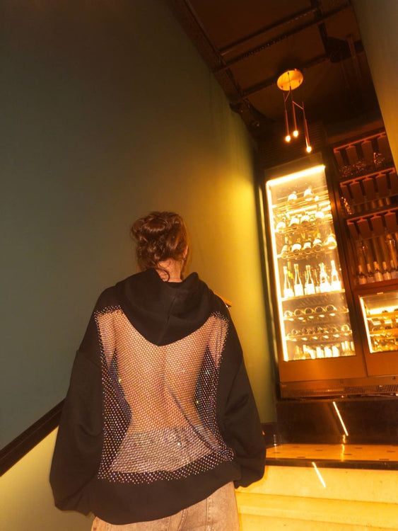 Sparkle in Comfort: Rhinestone Mesh Hoodie